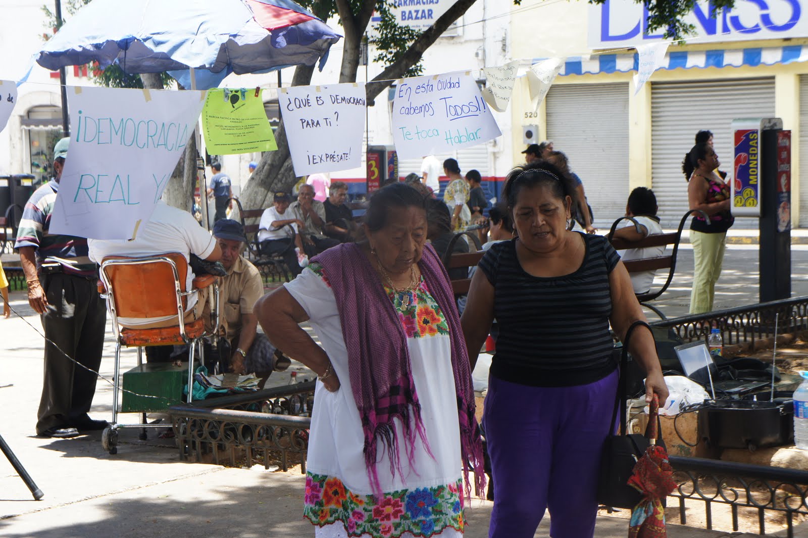 A Mèxic no és fàcil expressar-se lliurement. A Mèxic no és fàcil criticar els polítics. A Mèxic no és fàcil ocupar les places i els espais públics i cridar als quatre vents que les coses no van bé. A Mèxic és difícil aconseguir que la gent es pronuncïi. Perquè hi ha por. Perquè potser no hi ha interès a canviar les coses. Perquè la cultura democràtica és escassa i els pes dels mitjans de comunicació, que alienen i allunyen als ciutadans de la crua realitat, és massa fort. Però s'obren escletxes. Estretes però sòlides en el gest i la intenció. Una d'elles es va obrir el passat 19 de juny a Mérida en el marc de la mobiltzació mundial a favor d'una democràcia real. Els ecos del moviment a Europa arriben a Mèxic aplacats per la distància però amb la il·lusió col·lectiva de que, dialogant, és possible dibuixar una nova realitat social. L'acte es va ubicar al mercat, on no hi ha turistes. Els vianants escrivien, xerraven,observarven i intentaven imaginar-se a la seva manera, un món millor. Potser els costava perquè ningú no els ho havia preguntat abans, però s'hi esforçaven, i d'aquell matí mig ennuvolat en van sortir propostes que haurien de ser escoltades perquè són dignes i sorgeixen de la veu del carrer.